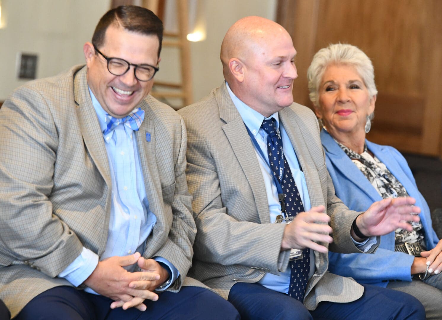 Adair County Schools Director of Pupil Personnel Robbie Harmon ’97, left, reacts to a comment by Russell County Schools Superintendent Michael Ford ’97 during a Lindsey Wilson University “Career Week” panel in the university’s Norma and Glen Hodge Center for Discipleship. At right is Hilda Legg ’72, a government and public policy consultant.
