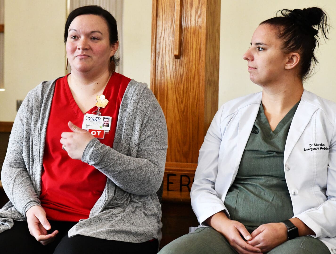 Dr. Bailey Gifford ’15, left, discusses the professional road that led to becoming an occupational therapist during a Lindsey Wilson University “Career Week” panel in the university’s Norma and Glen Hodge Center for Discipleship. At right is Dr. Hannah Morales ’15.