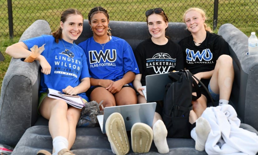 Lindsey Wilson University students Harper Gregory ’29 of Elizabethtown, Kentucky, Tyria Tanner ’27 of Cleveland, Tennessee, Emerson Gregory ’29 of Elizabethtown and Maebrie Cochran ’29 of Elizabethtown celebrate “Couch Night” (and homework) on Wednesday, Oct. 1, on an inflatable couch that Cochran brought to campus last August. All four are members of the JV women’s basketball team and the women’s flag football team.
