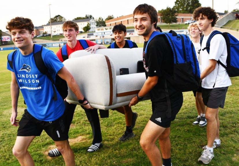 Lindsey Wilson University student Zach McCaslin ’27 of Owensboro, Kentucky, left, leads his track and field teammates as they search for a location for their couch on “Couch Night” during the Wednesday, Oct. 1, Lindsey Wilson-Cumberland (Tennessee) University soccer doubleheader on Ray Wells Field at Walter S. Reuling Stadium.