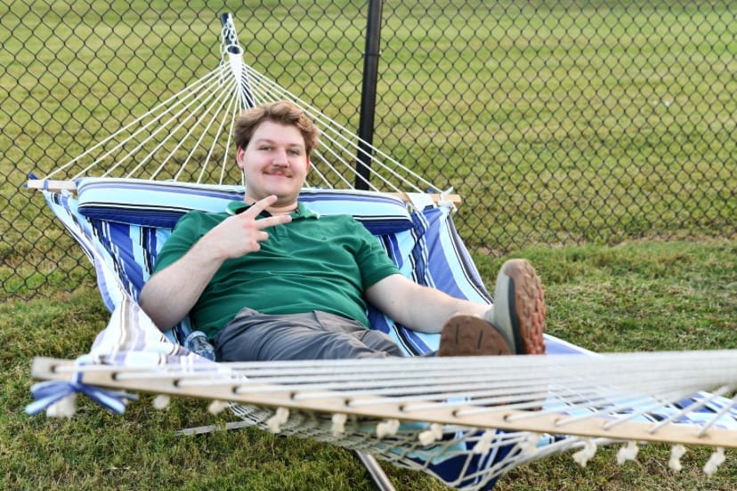 Lindsey Wilson University nursing senior Jared Wyatt ’26 of Glasgow, Kentucky, relaxes in a hammock on “Couch Night” during the Wednesday, Oct. 1, Lindsey Wilson-Cumberland (Tennessee) University soccer doubleheader on Ray Wells Field at Walter S. Reuling Stadium.