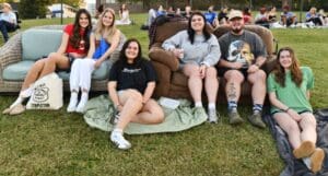 Lindsey Wilson University students, from left, Elayna Popplewell ’27 of Russell Springs, Kentucky, Pearsyn Ingram ’27 of Science Hill, Kentucky, Halle Burton ’26 of Columbia, Mattie Willis ’26, Seth Ousley ’26 of Lancaster, Kentucky, and Amber Loy ’26 of Columbia enjoy “Couch Night” on Wednesday, Oct. 1, at Walter S. Reuling Stadium during the Lindsey Wilson-Cumberland (Tennessee) University soccer doubleheader on Ray Wells Field.