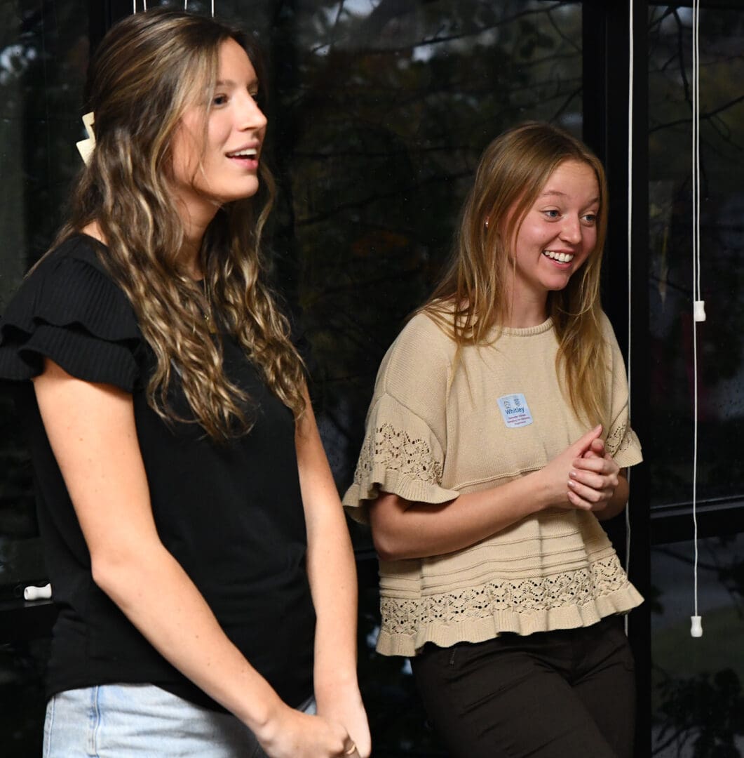 Lindsey Wilson University students Emma Snyder ’26, a human services and counseling major from Glasgow, Kentucky, left, and Whitley Gibson ’27, a human services and counseling and media studies double major from Edmonton, Kentucky, discuss their experiences at Harlaxton College during a presentation about the study-abroad experience on Thursday, Oct. 29, in the J.L. Turner Leadership Center.