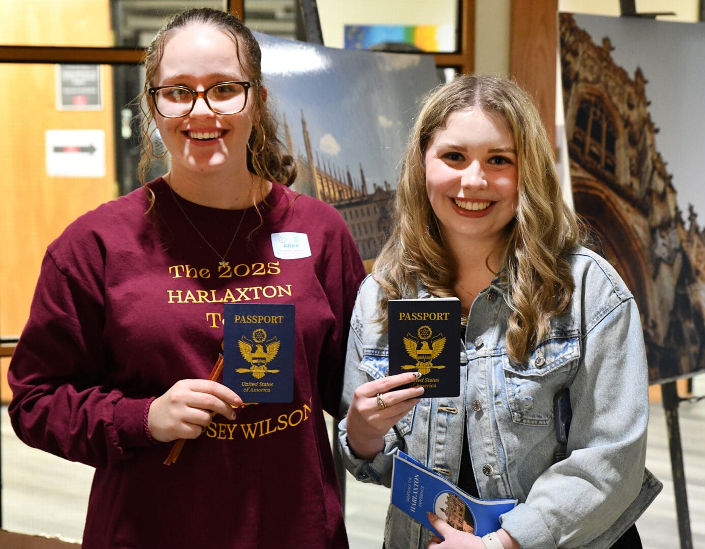 Lindsey Wilson University students Allee Harris ’26, a business administration major from Harrodsburg, Kentucky, left, and Reagan Black ’26, an education major from Liberty, Kentucky, display promotional passports that students received while learning about study-abroad opportunities at Harlaxton College on Thursday, Oct. 29, in the J.L. Turner Leadership Center.