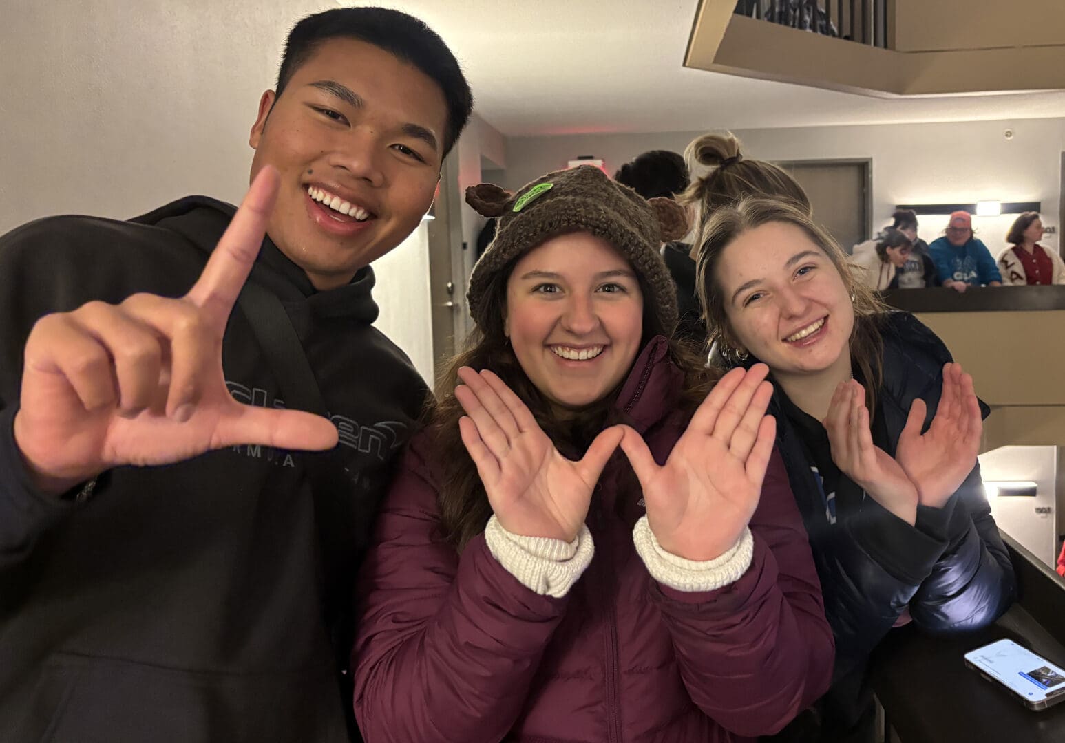Lindsey Wilson University students take a break before performing in the 2026 All-Collegiate Honor Choir, which performed Feb. 5 at Whitney Hall of the Kentucky Center for the Arts in Louisville. From left: Polakrit Pawichai ’28 of Columbia, second tenor; Sabrina Ruiz ’26 of Louisville, first alto; and Brinkley Todd ’27 of Louisville, first alto.