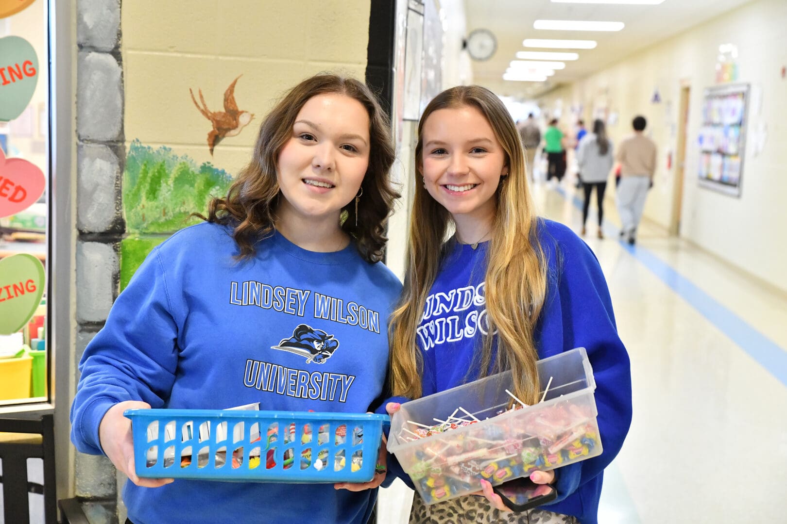 Lindsey Wilson University students Hailey Rowe ’29, left, and Kaylei Neat ’29, both of Columbia, attended Read Across Adair County as first-grade students at Adair County Primary Center. On Thursday, Feb. 26, they helped serve students and their family members who attended the 2026 edition of the annual event. Rowe handed out pencils and trinkets to children and their family members, and Neat distributed complimentary candy.