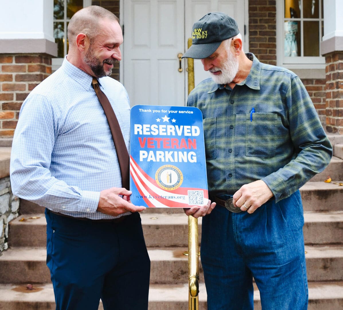 Lindsey Wilson University Dean of Students Chris Schmidt, left, shows Russell Lunsford ’70, commander of Veterans of Foreign Wars Post 6097, one of the six special parking signs for veterans that will be installed on campus.