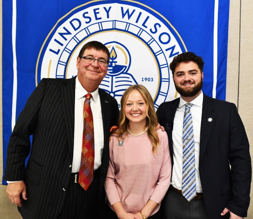 Lindsey Wilson University President William T. Luckey Jr., left, is joined by Whitley Gibson ’27 of Edmonton, Kentucky, and Zachariah Lawson ’26 of Williamsburg, Kentucky, who were the student speakers at the university’s Fall Trustee Appreciation and Endowed Scholarship Luncheon, held Friday, Oct. 24, in the Roberta D. Cranmer Dining & Conference Center.
