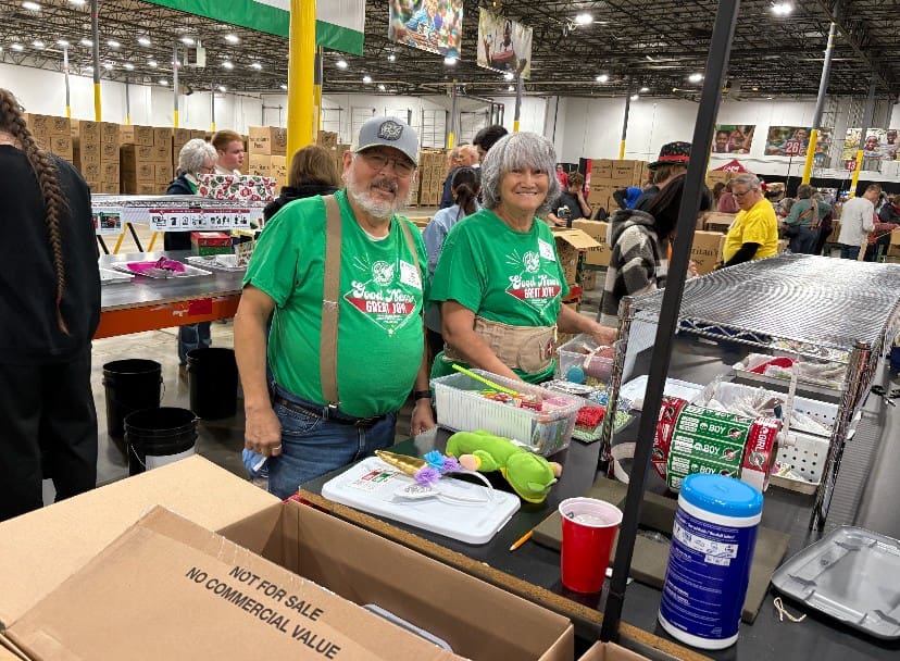 This group of volunteers recently traveled to the Samaritans purse Operation Christmas Child processing center in Atlanta, Georgia. The group has been busy this week processing OCC shoebox gifts. These boxes will be traveling to other countries, to bless children over the world over the next few weeks. Pictured from left are OCC Ky Director Clint Fields, Mark Fudge, Denise Fudge, Tricia Malpica, Eric Malpica, Justin Burris, Pam Burris, Gail Watkins, Linda Watkins, Evan LaBarge, Aaron LaBarge, Patsy Wilson, Kerry Radford, Terrie Radford, Jackie Phelps, and Kathy Phelps. The group is made up primarily of individuals from the Columbia Baptist Church, but also has volunteers from other churches in the area as well. The Atlanta processing center has already processed more than 1 million shoebox gifts and hopes to reach 2 million shoeboxes by the end of next week. Nationwide at the eight processing centers across the United States, Samaritans Purse hopes to process over 12 million shoebox gifts over the next few days. An amazing statistic about the shoebox gifts in 2024 is that 27% of the recipients of shoebox gifts, led to the gift of salvation for the children receiving their boxes. Not only do the children receive the wonderful gifts in each shoebox, but they also receive gospel materials written in their own language, which consists of a 12 week study of the gospel. Columbia Baptist Church has had a group travel to the Atlanta processing center almost every year since 2016.