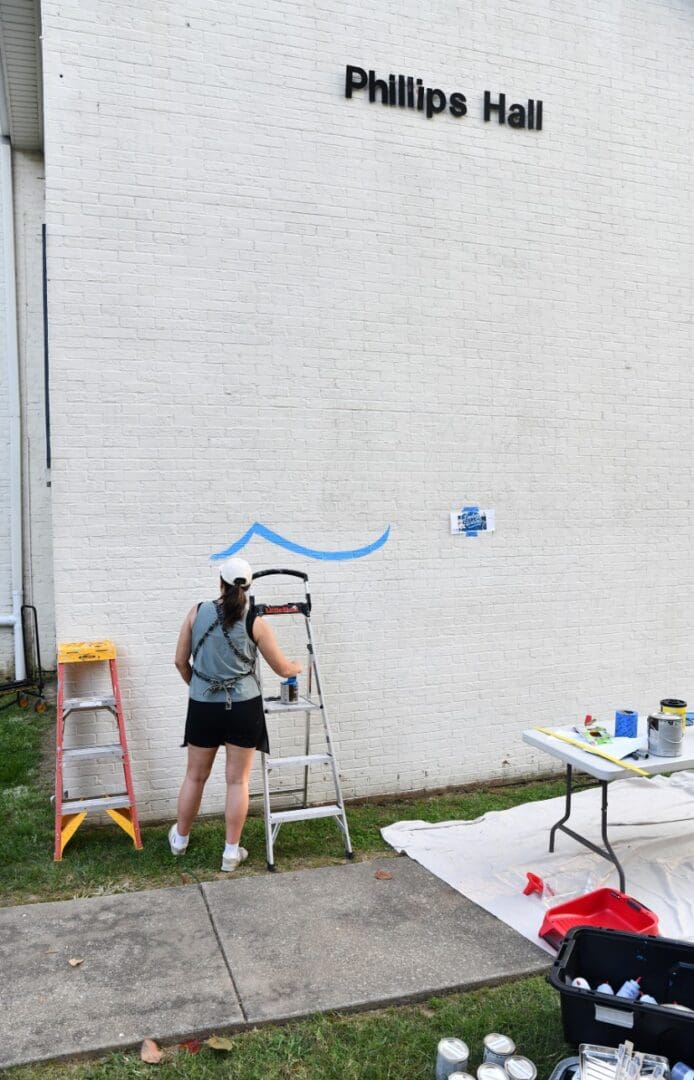 On the evening of July 27, Ford and her husband, Lucas, were joined by their children Sawyer, 12, and Daisy, 9, to sketch out in pencil the mural’s design on the Phillips Hall wall. Because of the oppressive heat and stifling humidity in late July, Ford worked on the mural primarily in evenings. A two-inch short-angle brush was her favorite tool to use to transfer the mural from paper to wall.