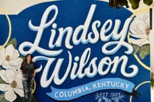 The mural, commissioned by the university, features “Lindsey Wilson” in script with “Columbia, Kentucky” printed on the bottom with “Est. 1903,” the year the school was founded. The Lindsey Blue background features magnolia tree flowers and pine cones, a tribute to the campus’ flora and heritage. Gold elements are a nod to the university’s historic John B. Begley Chapel.