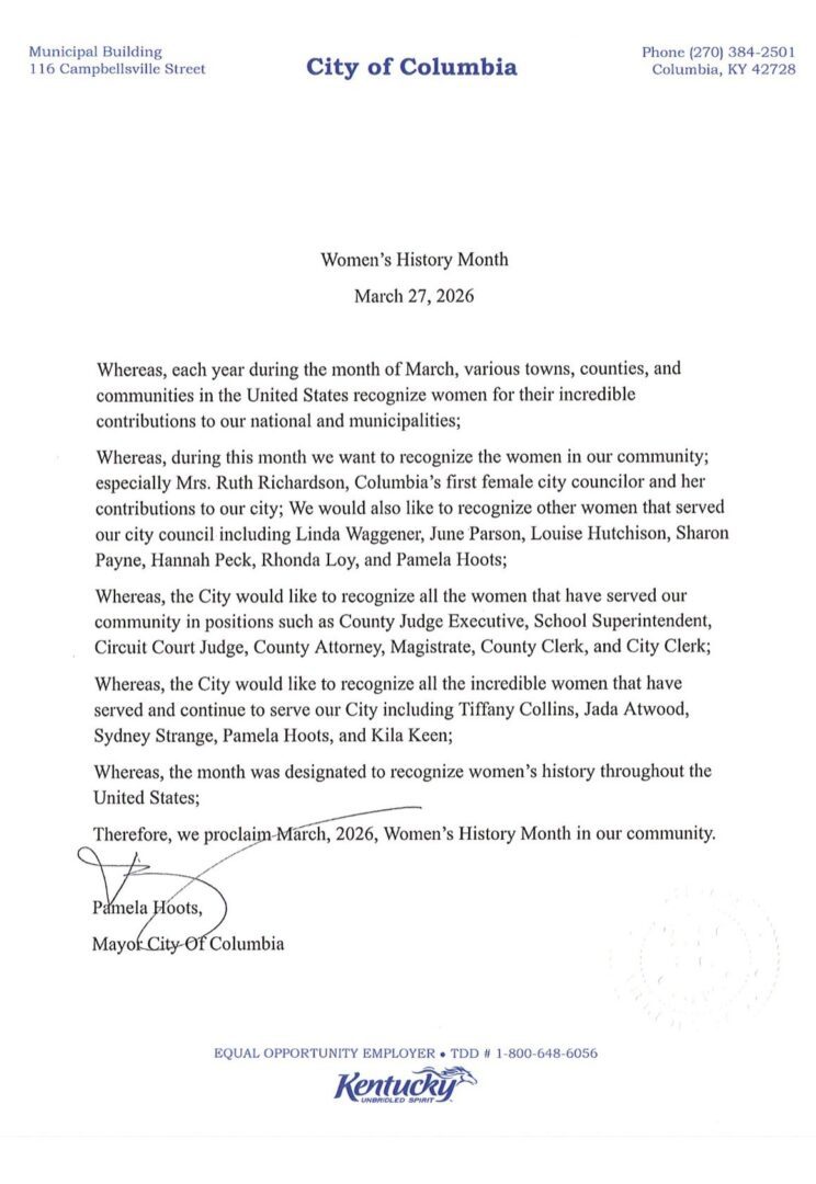 Mayor Pamela Hoots was deeply honored this morning, Friday, March 27, 2026, to proclaim Women’s History Month in Columbia.