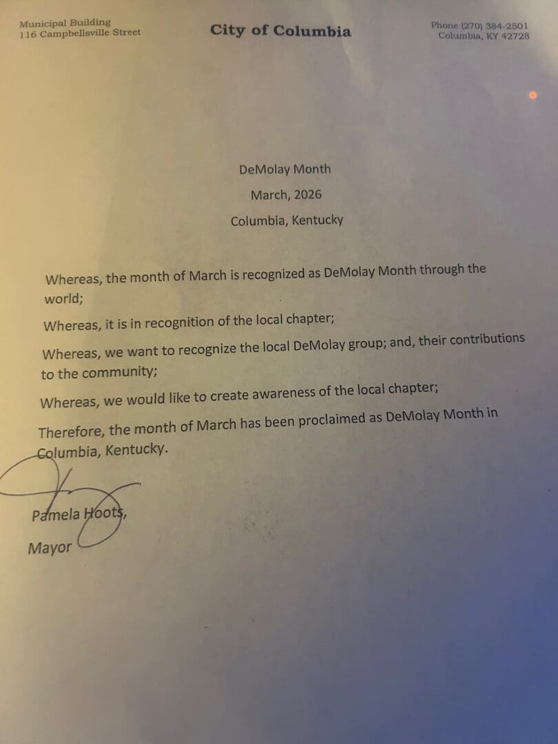 The month of March 2026 has been proclaimed as DeMolay Month in the City of Columbia.