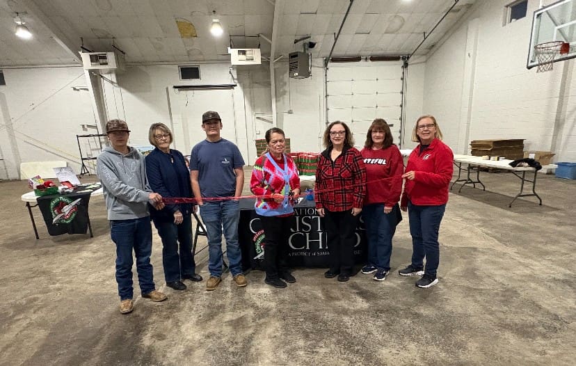 Mayor Pam Hoots did the honors of cutting the ribbon for the opening of the 2025 OCC drop off campaign. November 17th–24 has been designated worldwide as national collection week for OCC shoebox gifts. Pictured from left Jace Cole, Judy Cole, Dierks Cowan, Mayor Pam Hoots, Diana Eastham, Christine Williams and Denise Fudge.