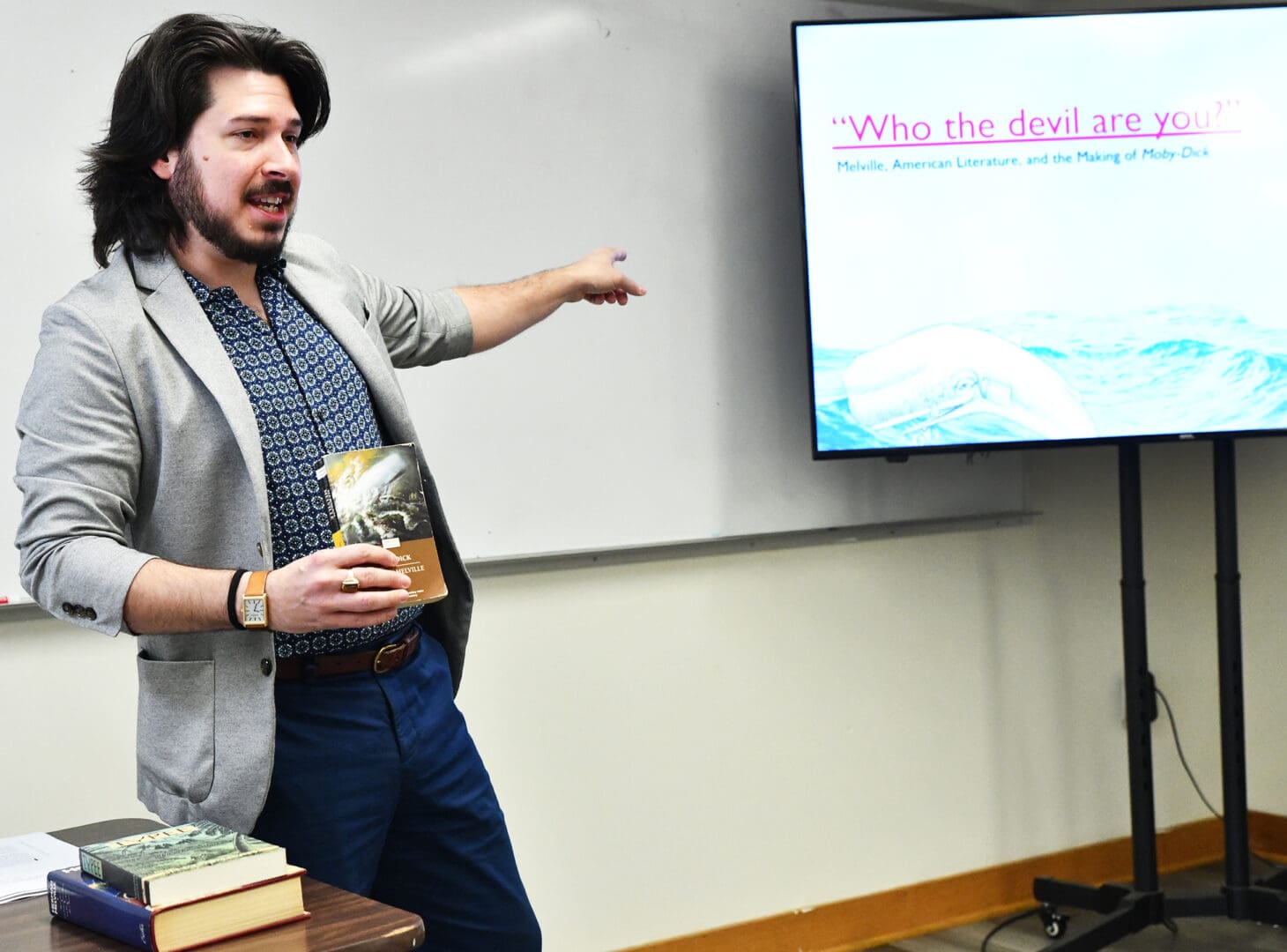 In Sewell’s “American Literature I” survey class, students are introduced to the writings of Herman Melville, including his epic 1851 novel, Moby-Dick; or, The Whale.