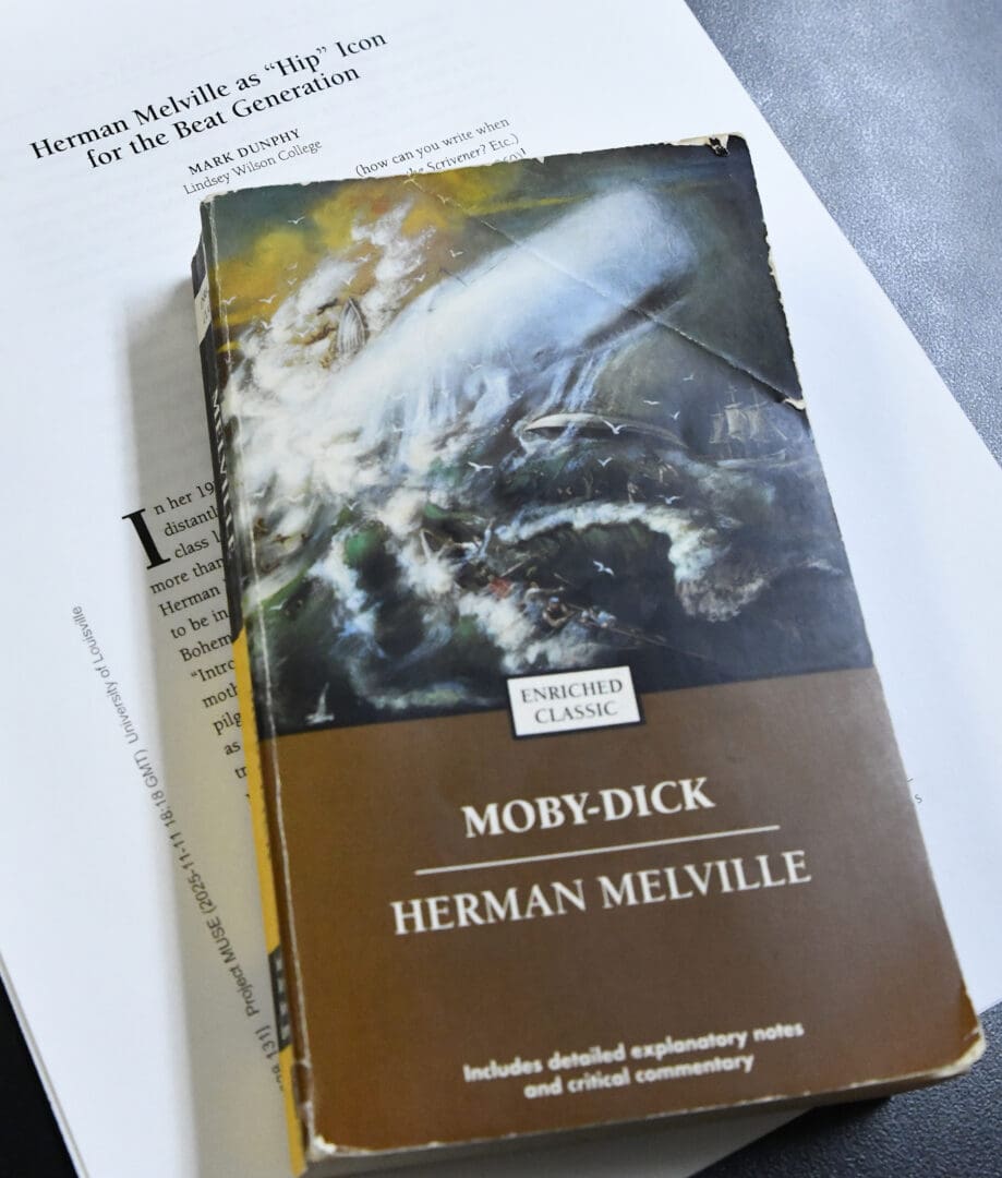 A copy of Lindsey Wilson University English professor Kendall Sewell’s “Moby-Dick; or, The Whale” and a paper about Melville’s influence on the American Beat Generation writers published by the late Mark Dunphy are two of the resources Sewell uses to teach about the 1851 novel to students in his “American Literature I” survey class.
