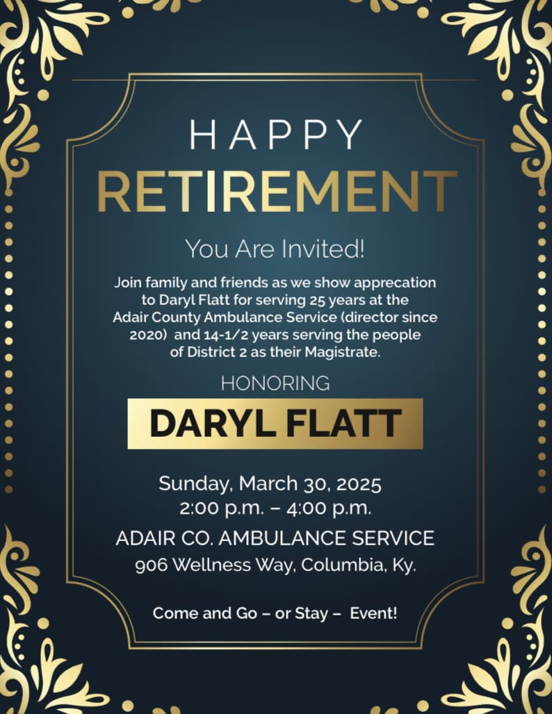 A retirement celebration will be held for Daryl Flatt on Sunday, March 30 from 2 p.m. until 4 p.m. at the Adair County Ambulance Service, 906 Wellness Way, Columbia.