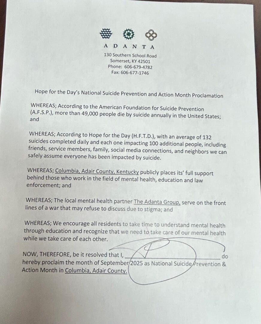 September has been proclaimed as National Suicide Prevention and Action Month as the result of a proclamation issued by Columbia Mayor Pamela Hoots.