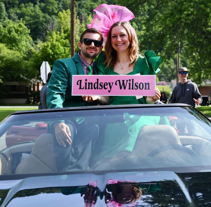 Lindsey Wilson College representative Sophia Hunziger ’25 of Rosendale, Missouri, and her escort, Tyler Tolle ’25 of Grand Junction, Colorado, prepare to ride in the parade of the 94th Kentucky Mountain Laurel Festival on Saturday, May 24, in Pineville, Kentucky. The Kentucky Mountain Laurel Festival is Kentucky’s second-oldest festival.