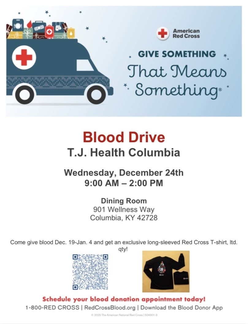 T.J. Health Columbia, in conjunction with the American Red Cross, will be hosting a community blood drive on Wednesday, December 24th from 9 AM to 2 PM at T.J. Health Columbia, 901 Wellness Way.