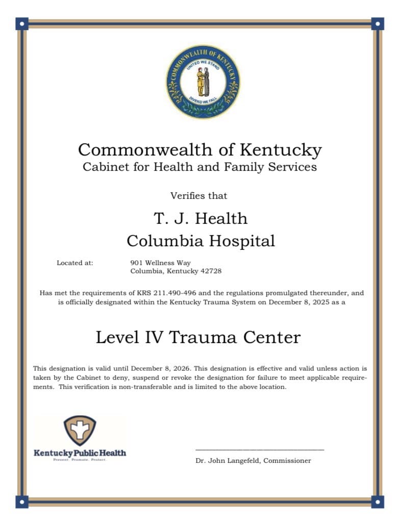 Glasgow, KY – T.J. Regional Health proudly announces that T.J. Samson Community Hospital and T.J. Health Columbia have each been officially designated as Level IV Trauma Centers, marking a historic milestone as the first trauma-designated hospitals in South Central Kentucky.
