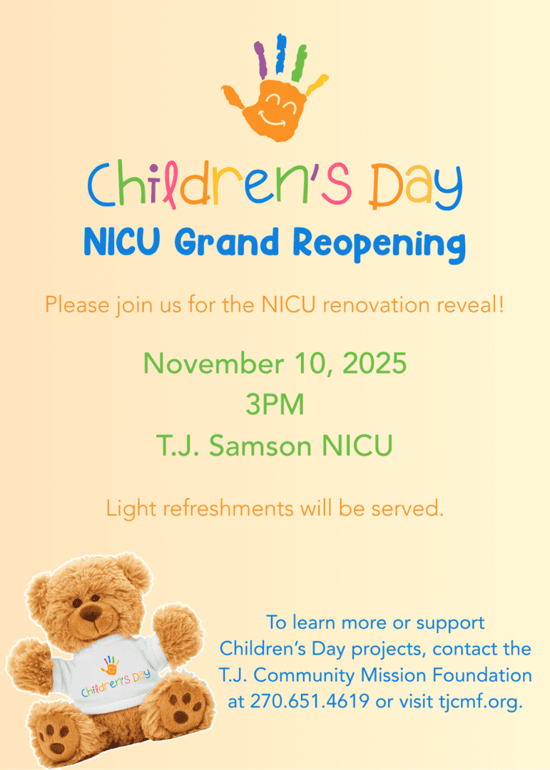 T.J. Samson Community Hospital invites the media and community members to celebrate the grand reopening of the Neonatal Intensive Care Unit on Monday, November 10th at 3:00 PM.