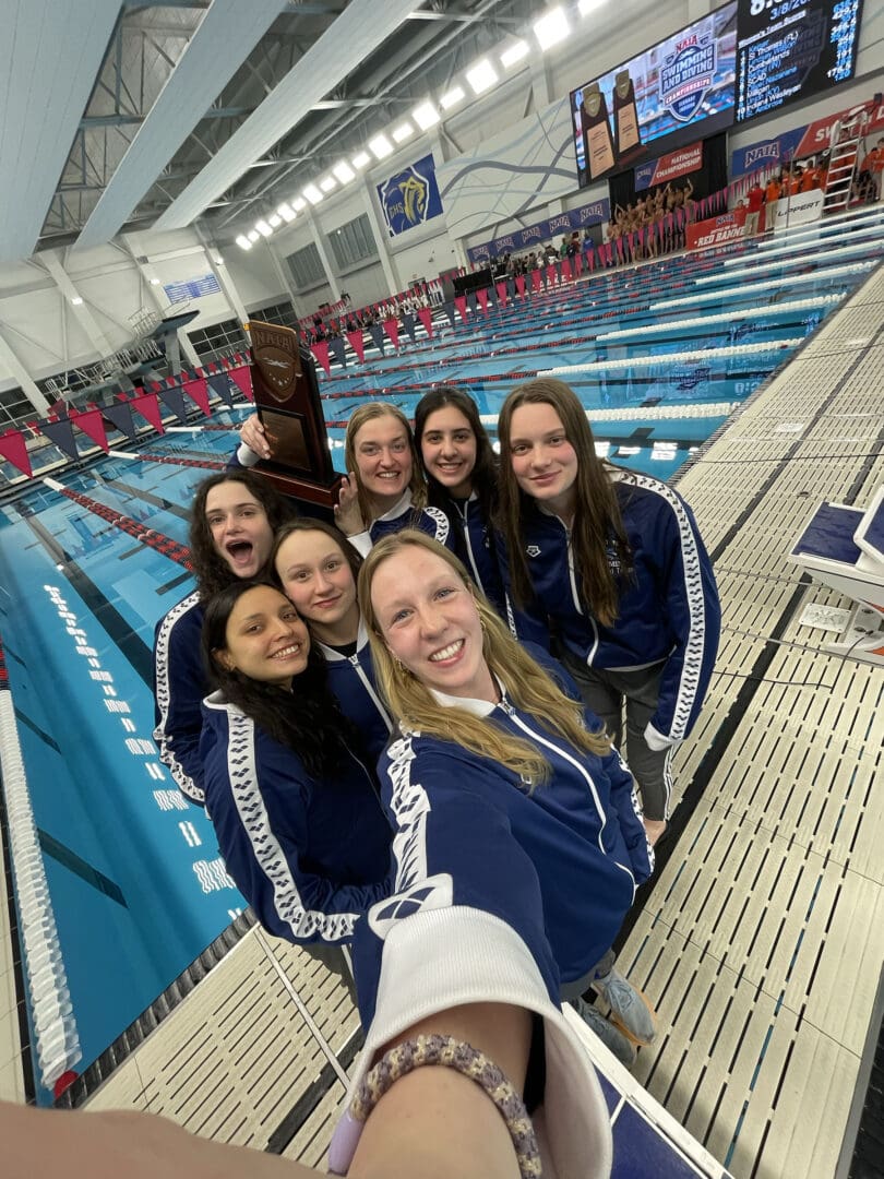 PHOTO – Members of the Lindsey Wilson College women’s swimming team take a selfie photo with their third-place trophy at the NAIA Swimming and Diving National Championships, held March 5-8 in Elkhart, Indiana.