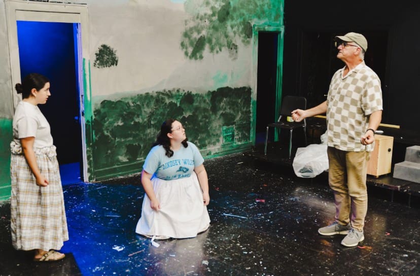 Lindsey Wilson University theatre professor Robert Brock gives direction to Sabrina Ruiz ’26 of Louisville, Kentucky, (who plays the character Meg Barton), left, and graduate student Kassidy Phelps of Burkesville, Kentucky (Miss Clara May Abbott), during a recent rehearsal of “Shiloh Rules,” which will be presented July 31-Aug. 3 at V.P. Henry Auditorium.