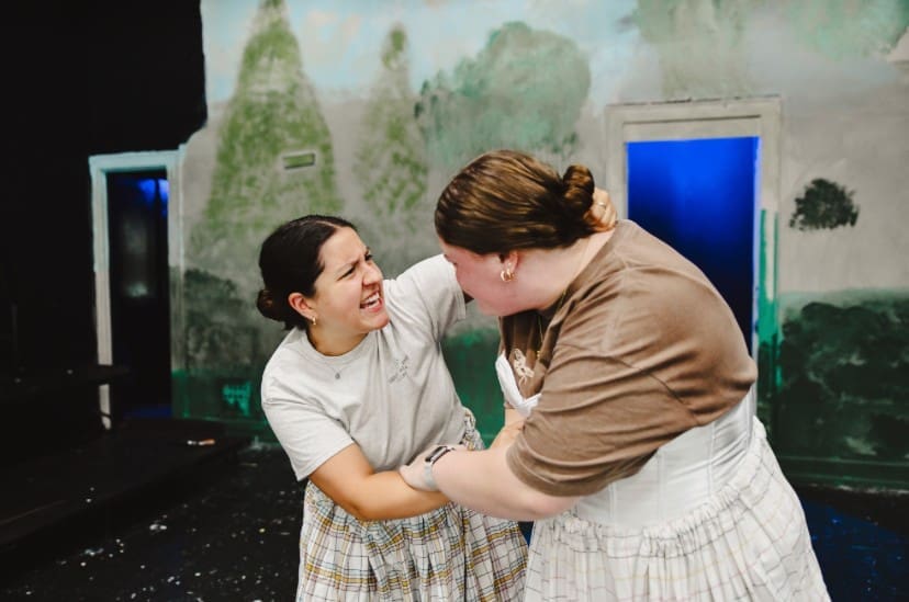 Lindsey Wilson University student Sabrina Ruiz ’26 of Louisville, Kentucky, (who plays the character Meg Barton), left, is confronted by Zoe Boatright ’28 of Columbia (LucyGale Scruggs) during a recent rehearsal of “Shiloh Rules,” which will be presented July 31-Aug. 3 at V.P. Henry Auditorium.